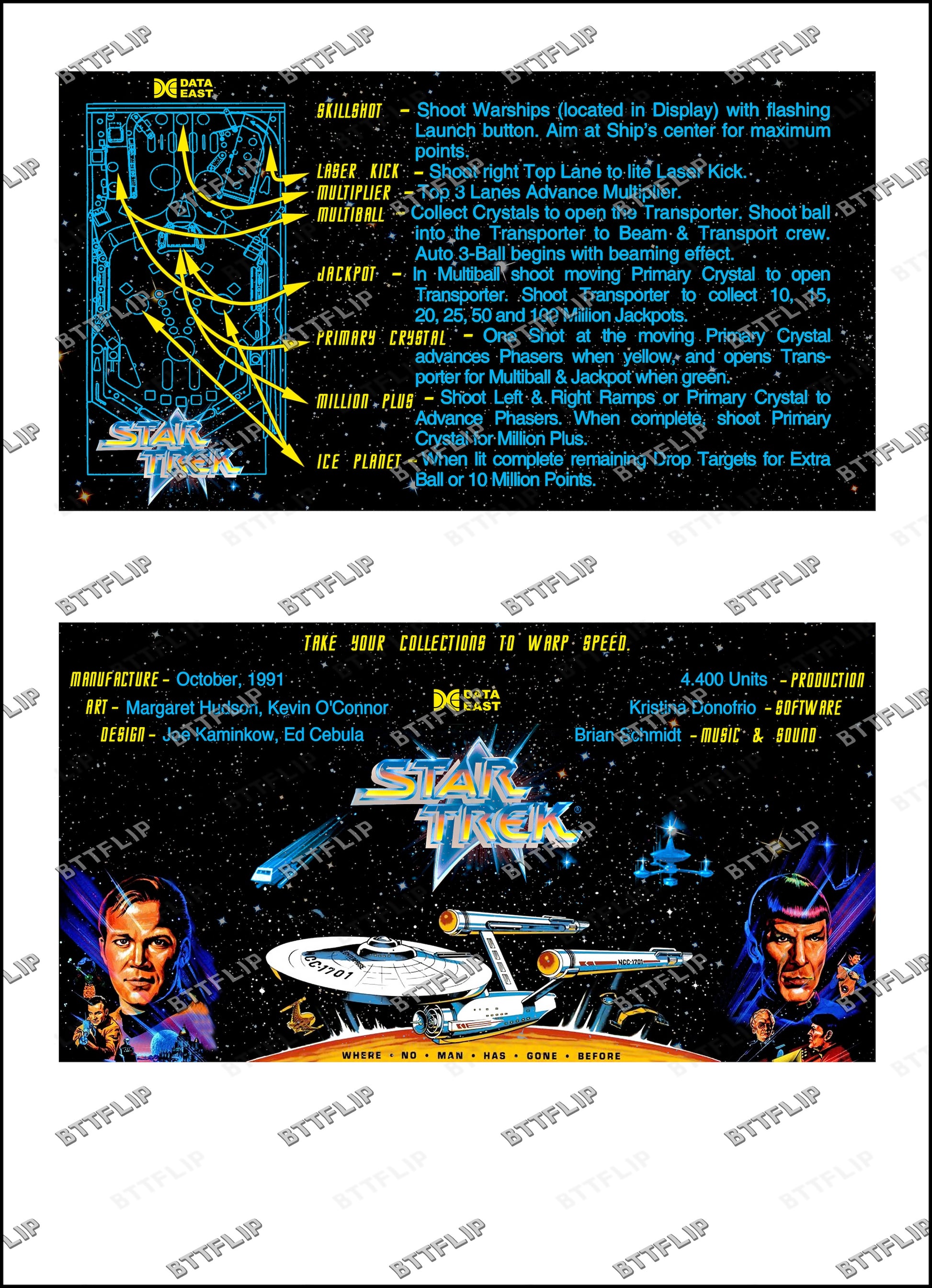 Data East STAR TREK 1991 Game Cards Instructions Pinball Custom Apron Printed Rules V1