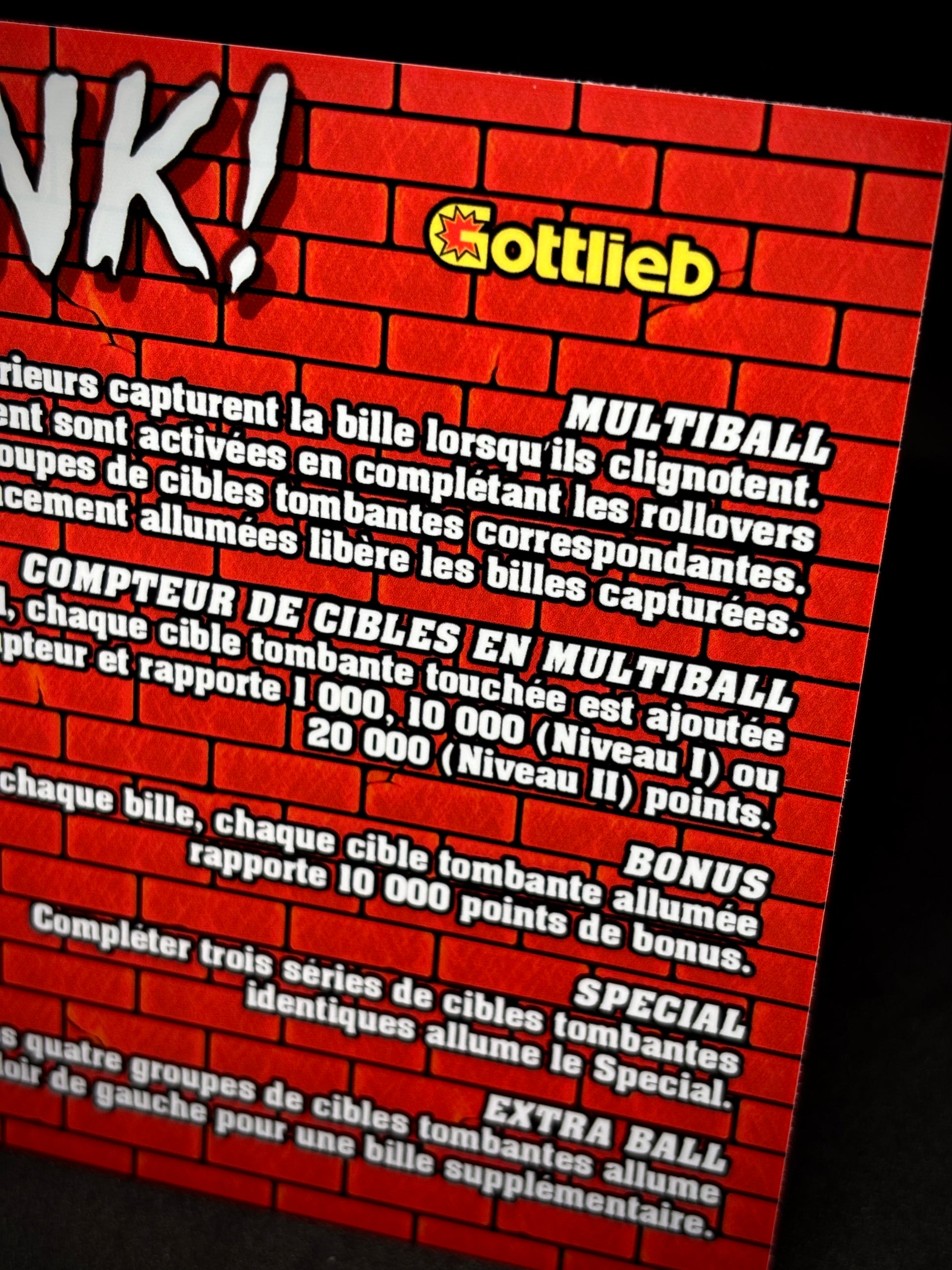 Gottlieb PUNK 1982 Game Cards Instructions Pinball Custom Apron printed rules