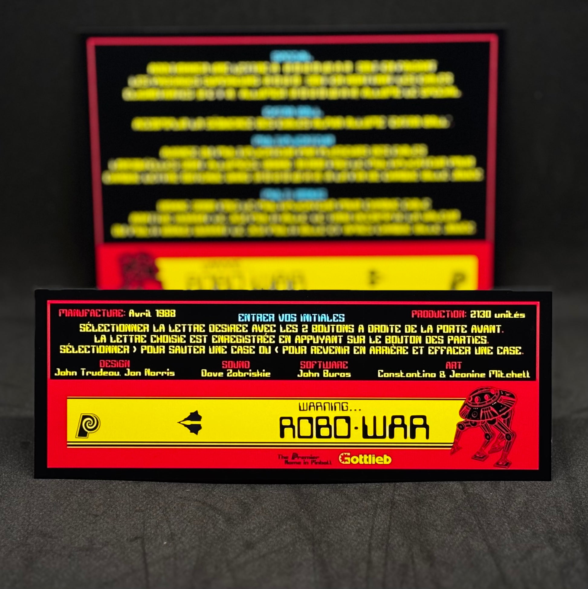 Gottlieb Robo-war 1988 Game Cards Instructions Flipper Custom Apron printed rules Robowar