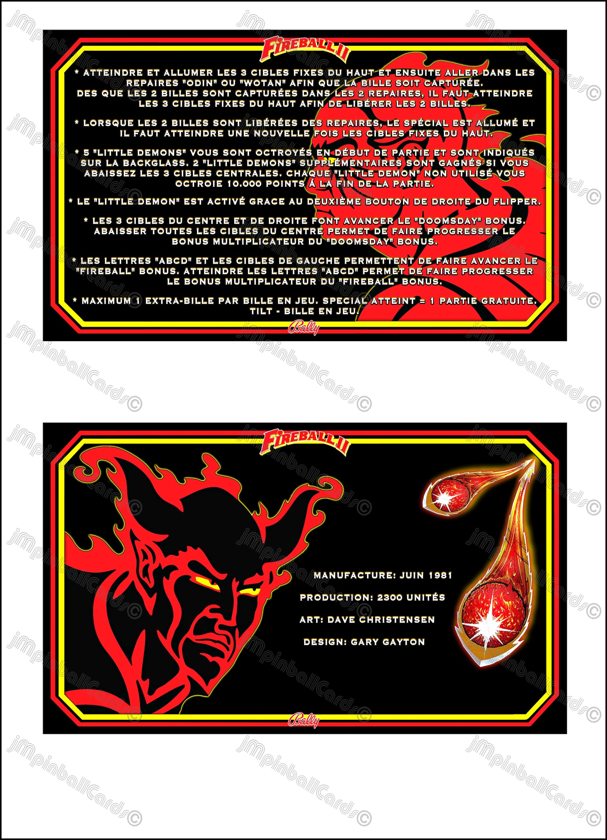 Bally Fireball II 1981 Jeu Cartes Instructions Flipper Custom Apron règles imprimées