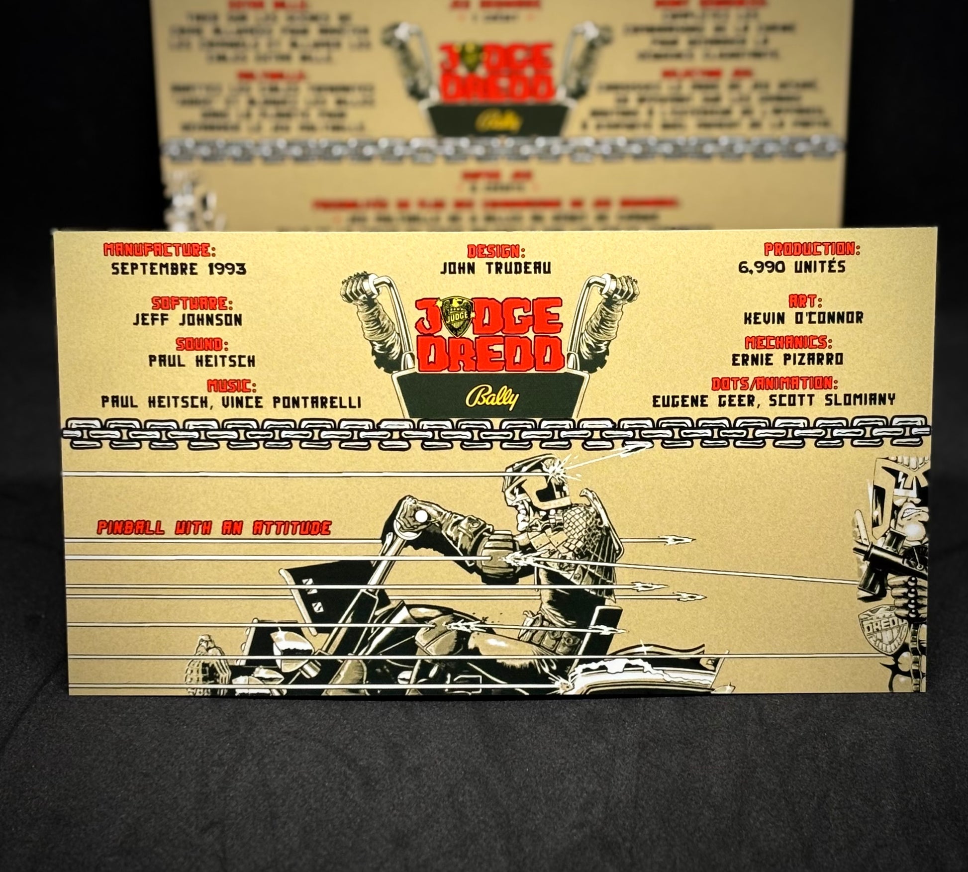 Instrucciones de las tarjetas de juego Bally JUDGE DREDD 1993, delantal personalizado de pinball, reglas impresas V2
