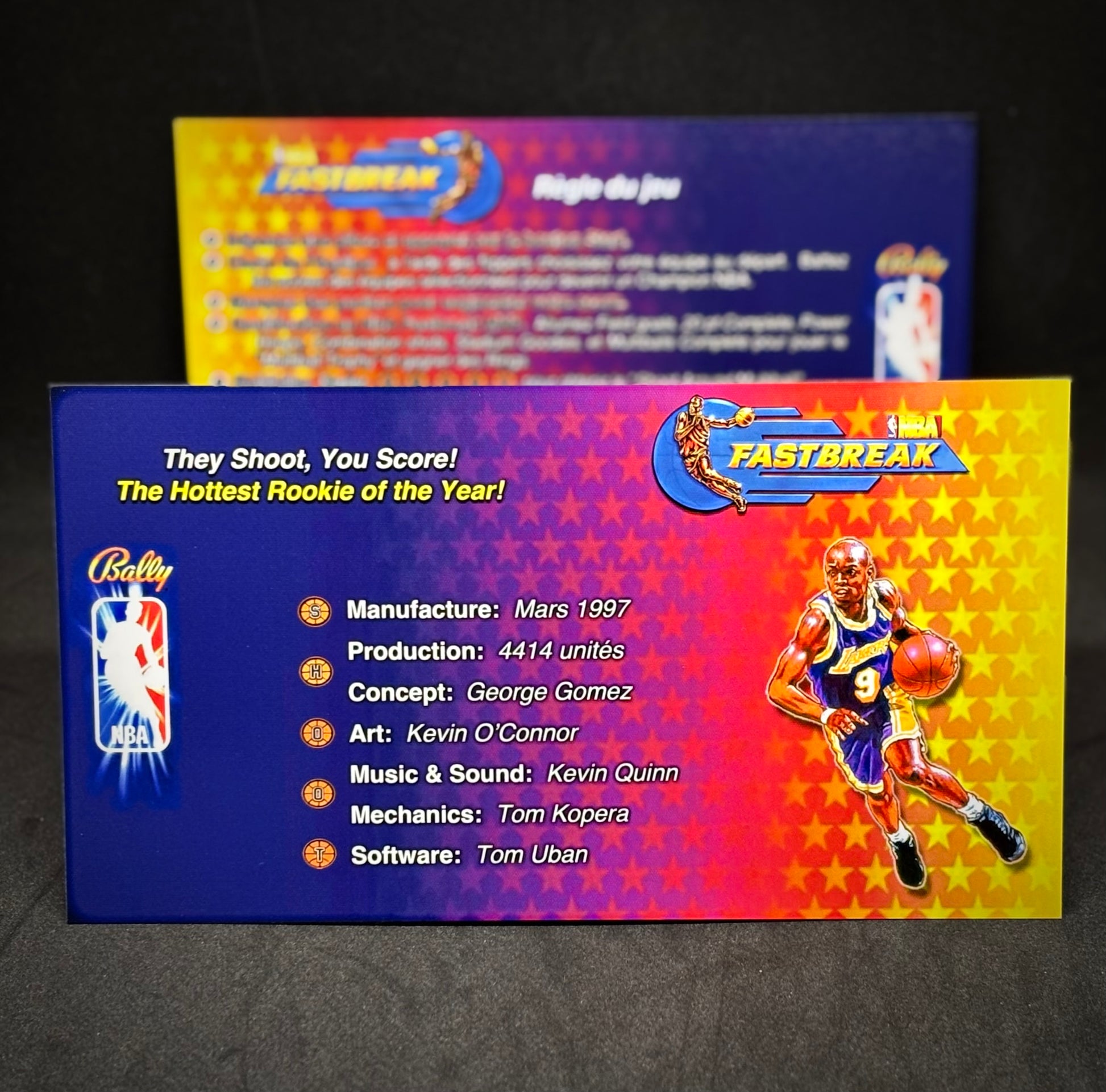 Bally NBA FASTBREAK 1997 Jeu Cartes Instructions Flipper Custom Apron règles imprimées V1