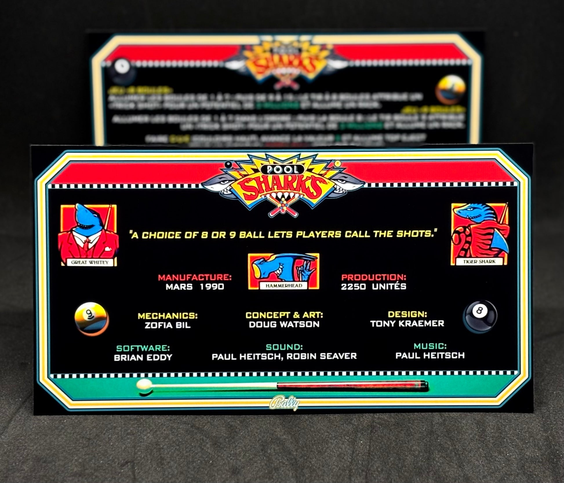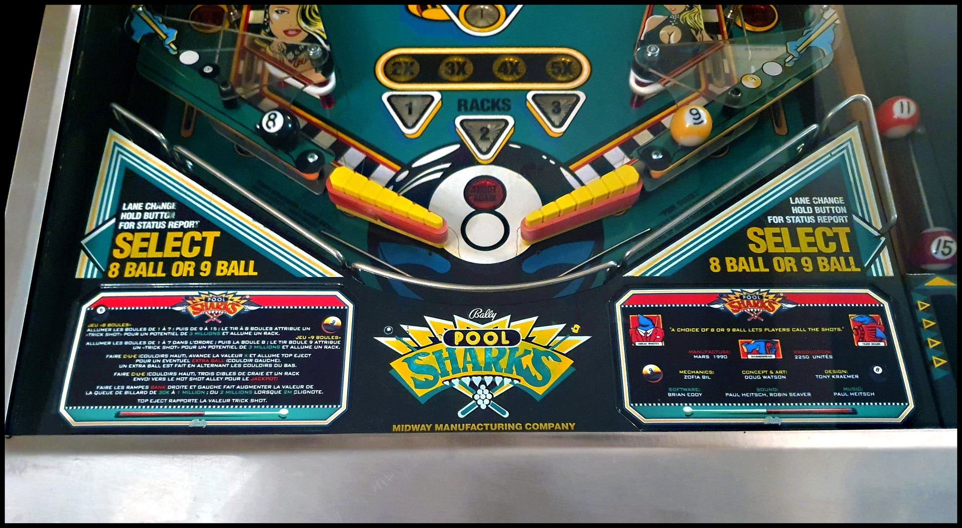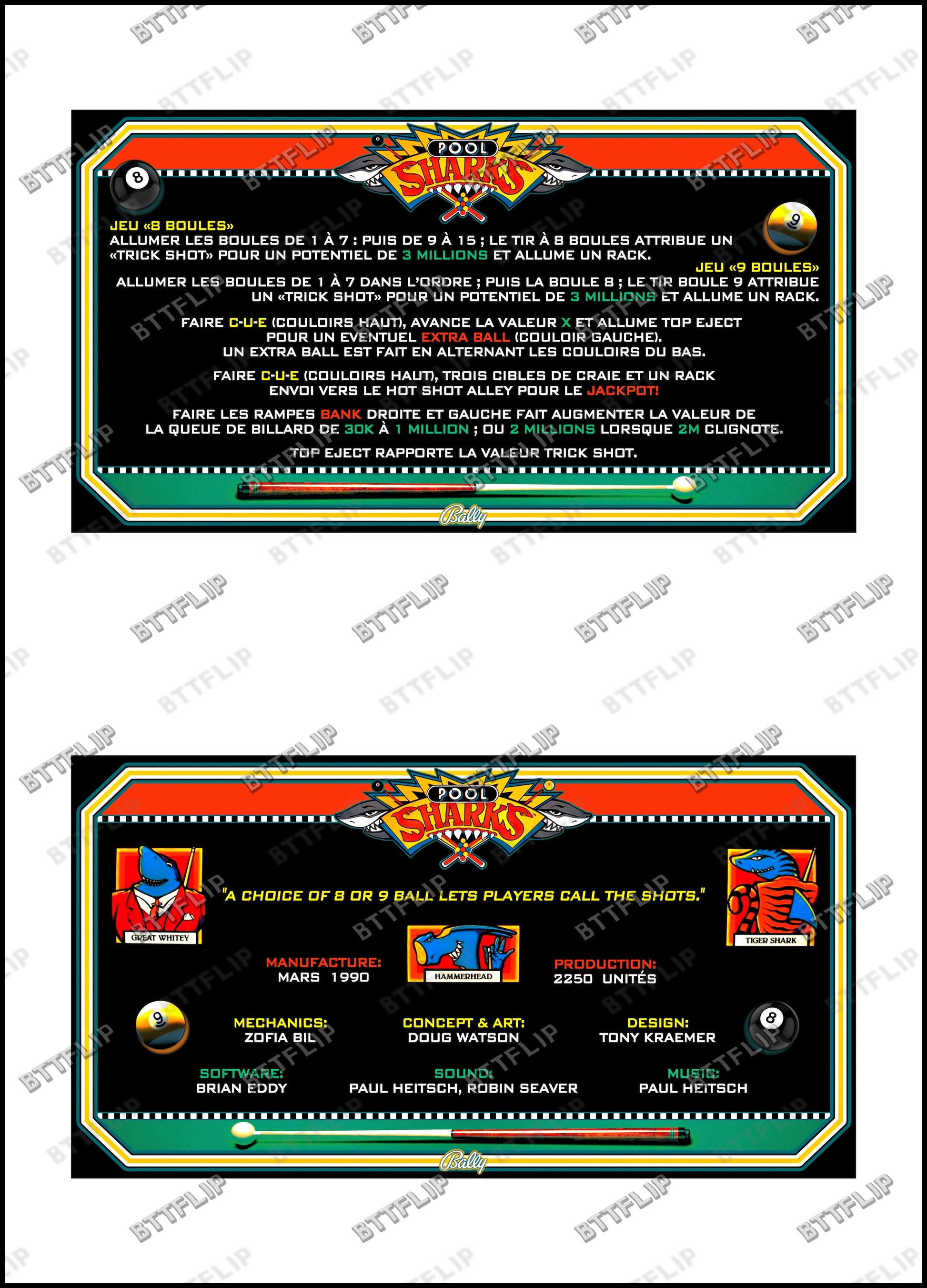 Bally POOL SHARKS 1990 Jeu Cartes Instructions Flipper Custom Apron règles imprimées