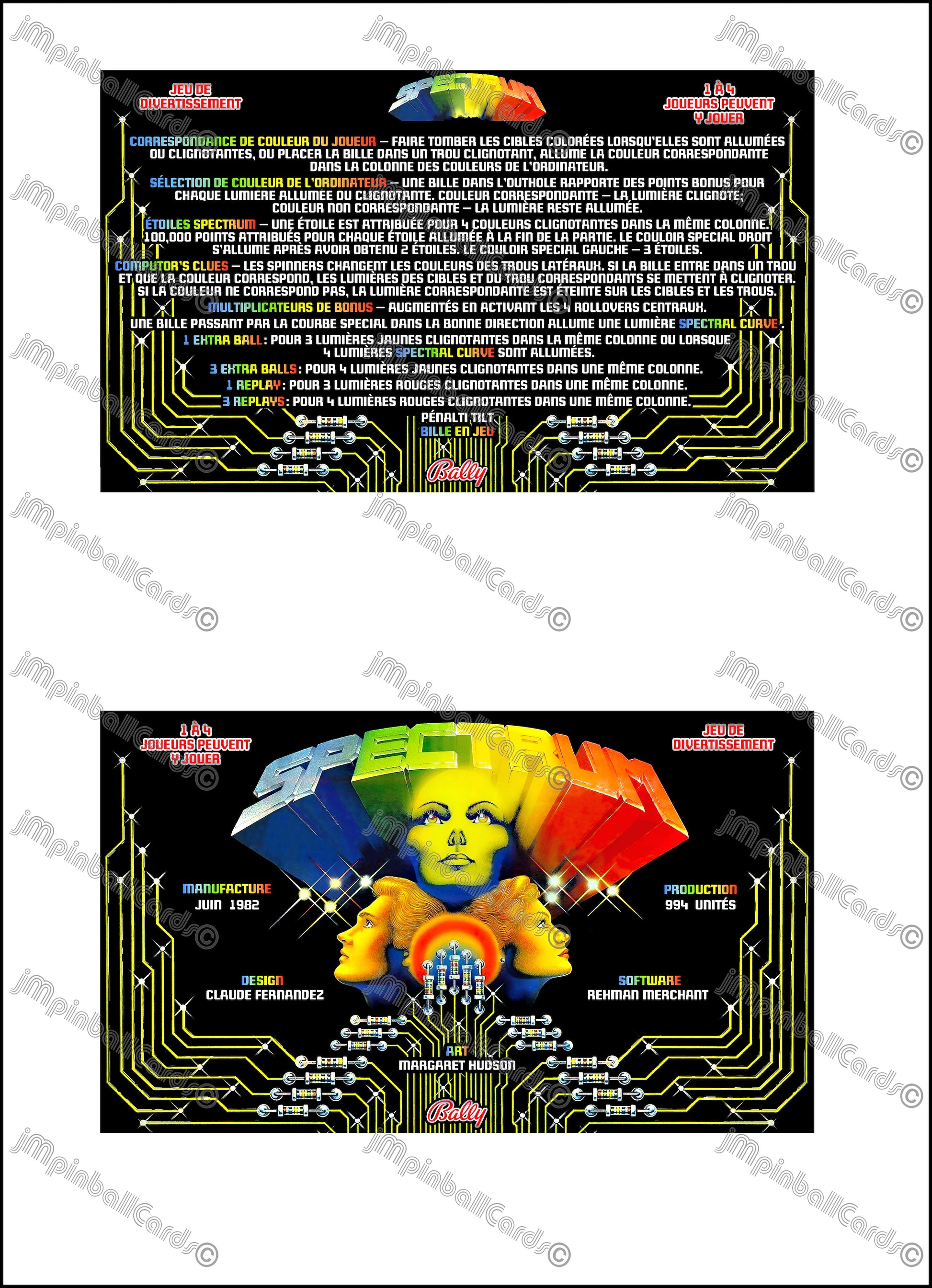 Bally Spectrum 1982 Jeu Cartes Instructions Flipper Custom Apron règles imprimées