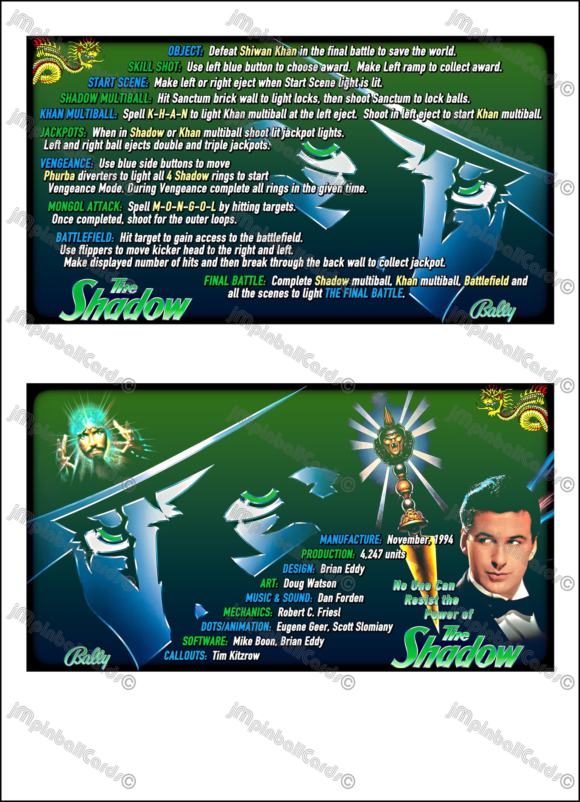 Bally The Shadow 1994 Jeu Cartes Instructions Flipper Custom Apron règles imprimées