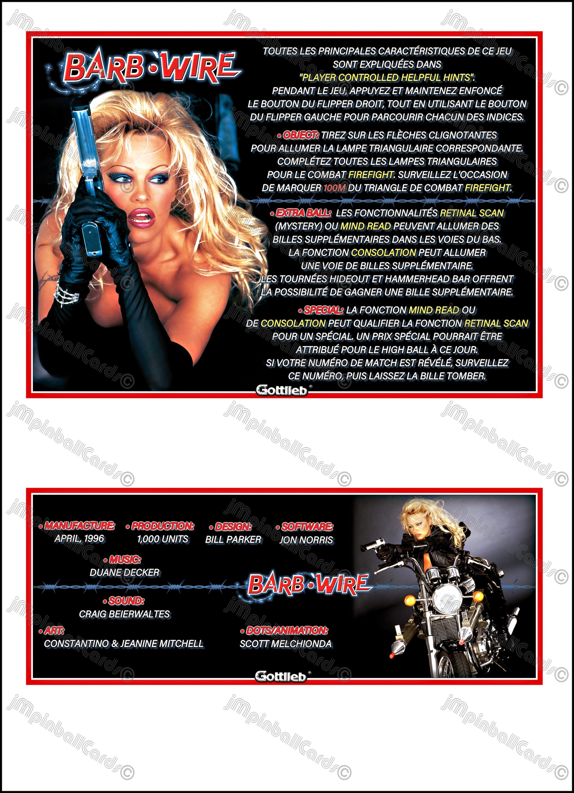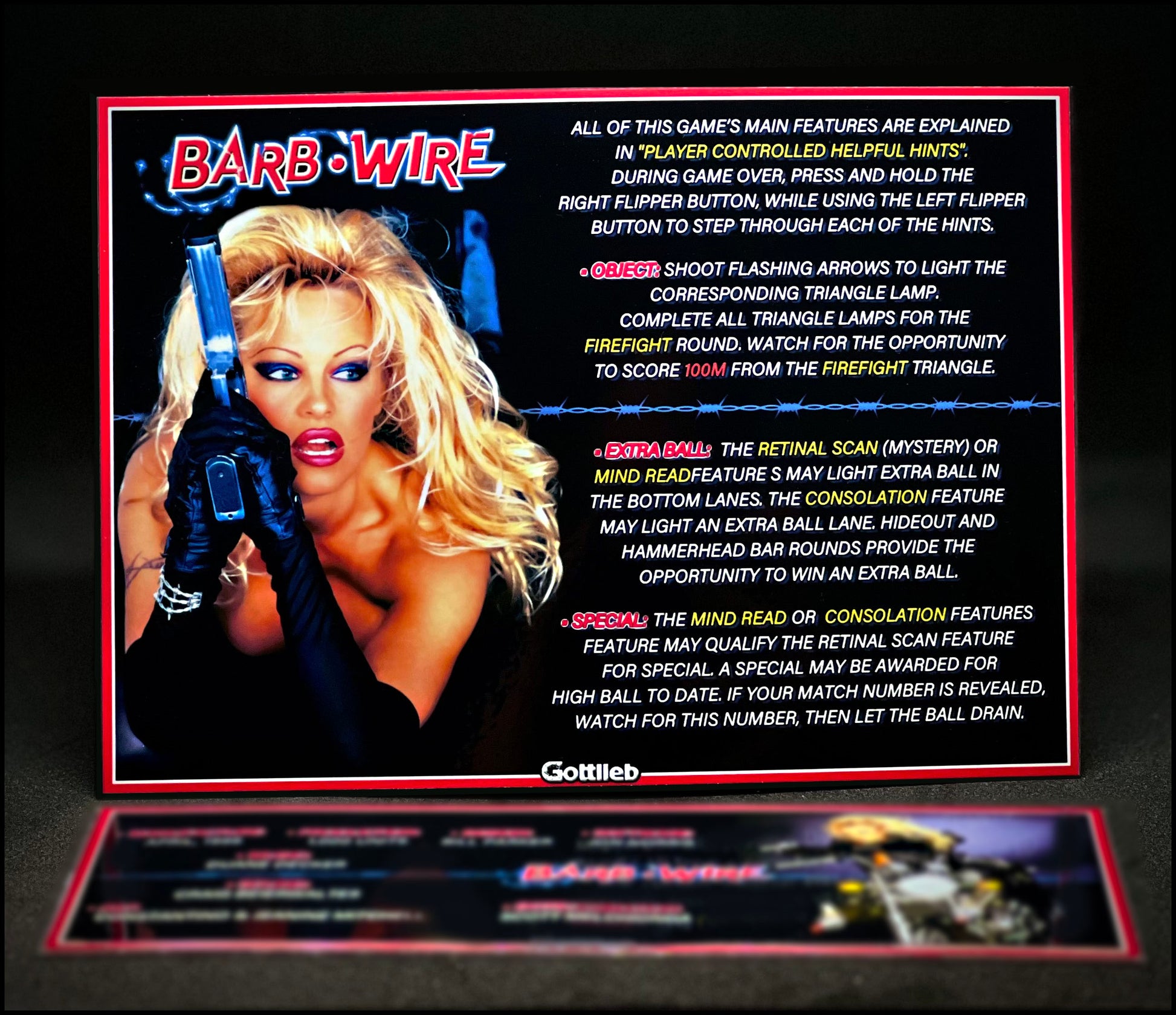 Instrucciones para tarjetas de pinball Gottlieb Barb Wire de 1996 - Tarjetas de pinball personalizadas con impresión de delantal, Pamela Anderson