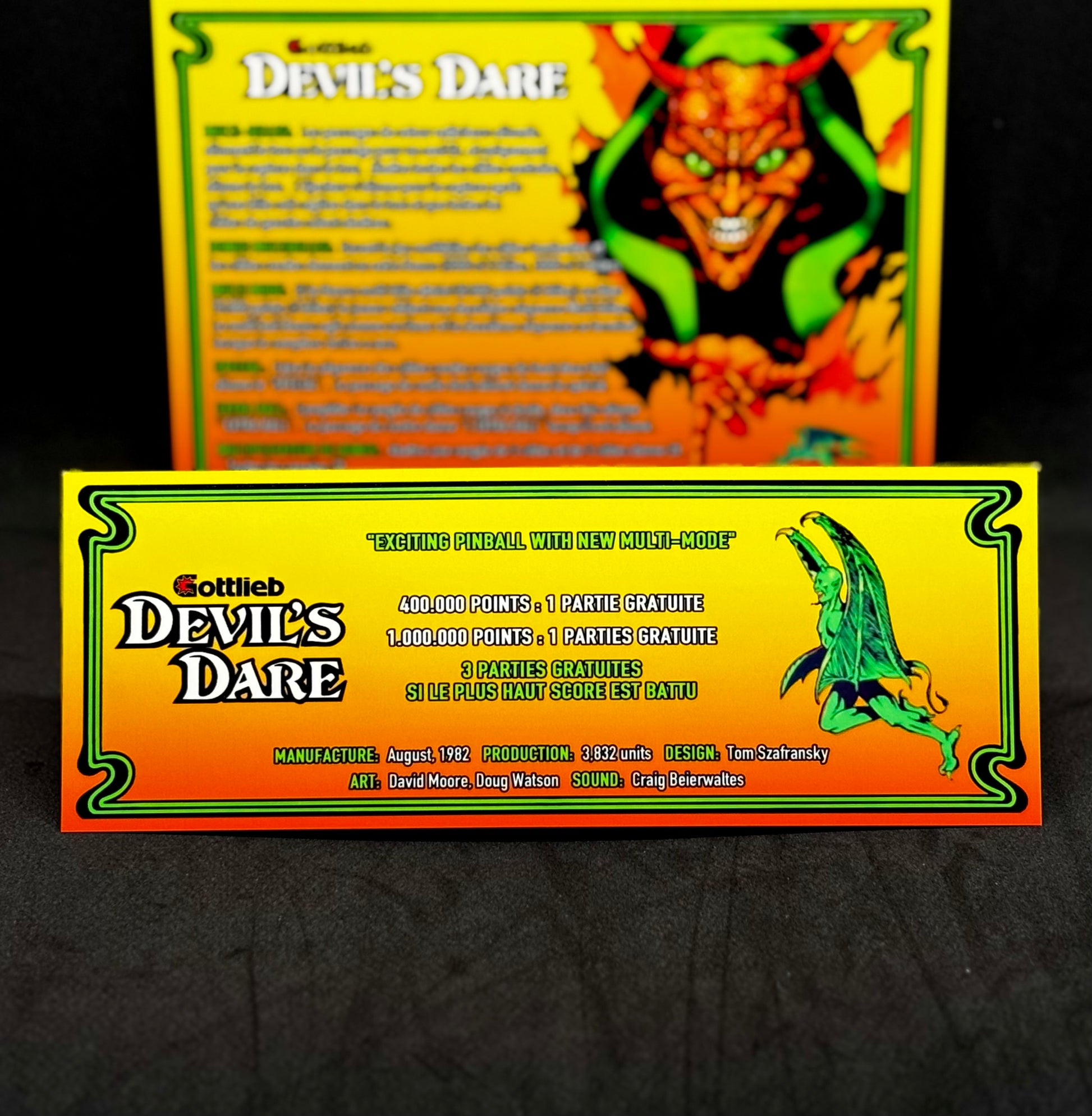 Instrucciones de las tarjetas del juego Gottlieb Devil's Dare 1982, versión 1 de pinball, tarjetas de delantal de pinball con impresión personalizada