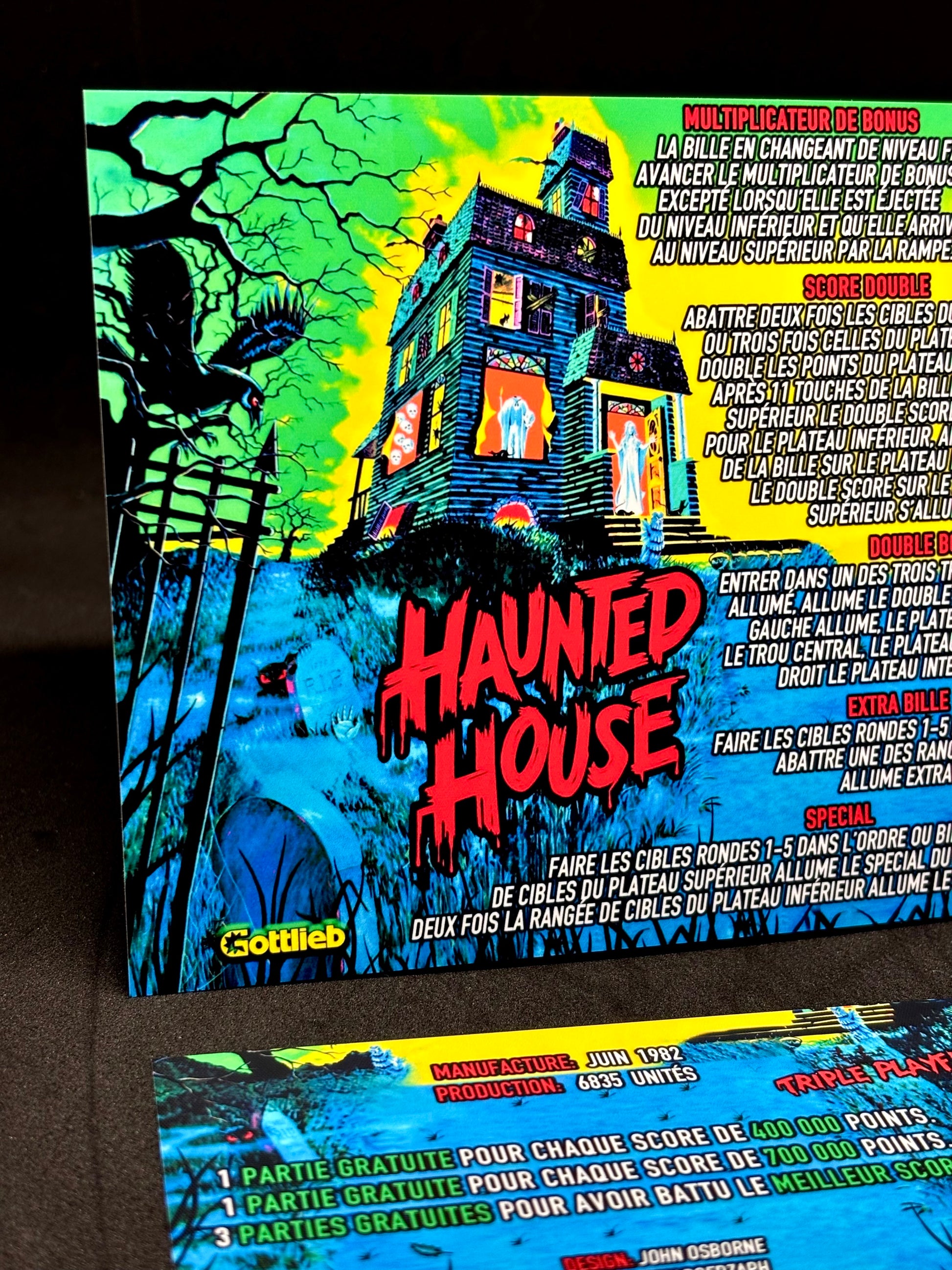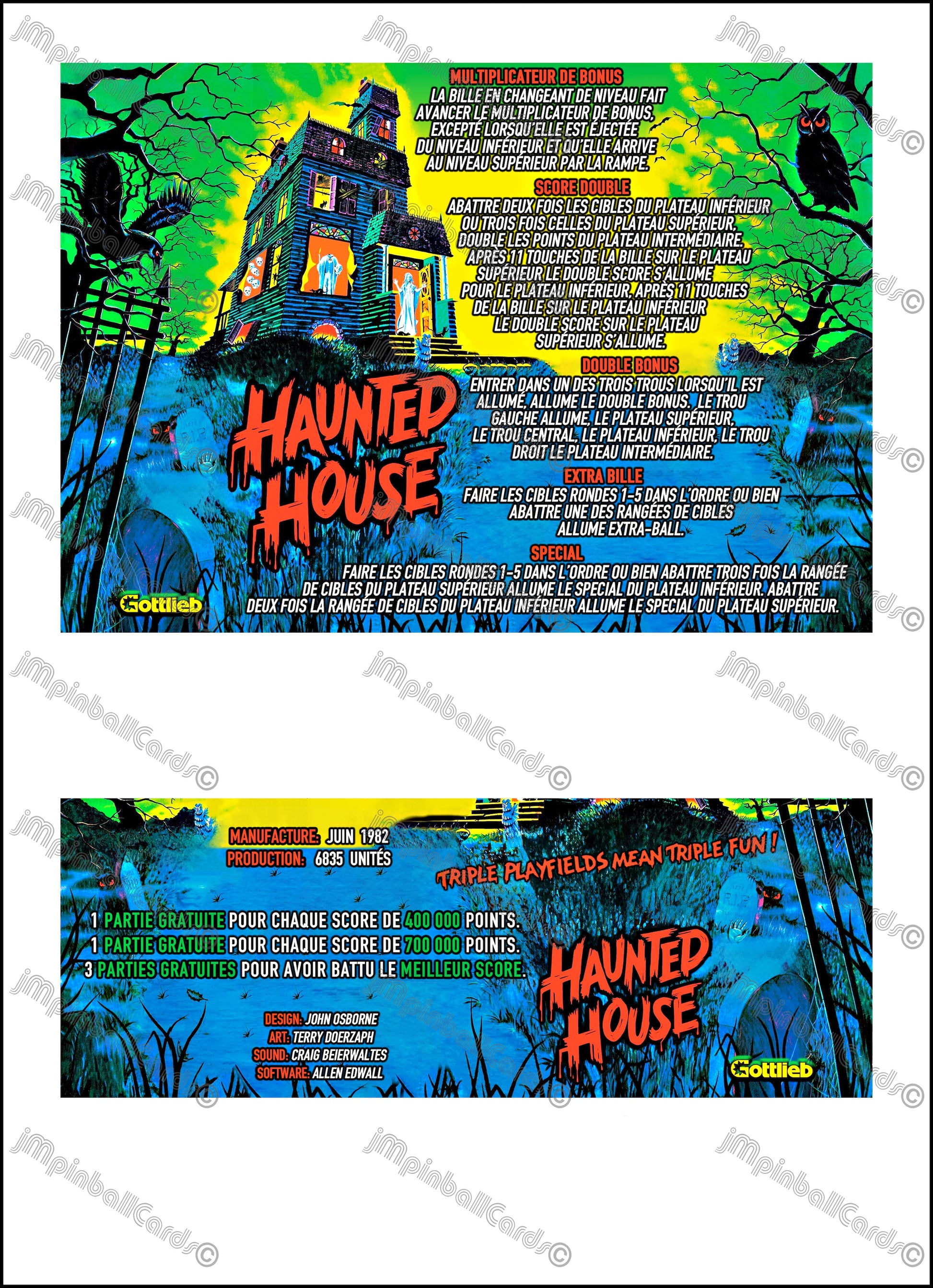 Instrucciones de las tarjetas del juego Gottlieb Haunted House 1982, versión 1 de pinball, tarjetas de delantal de pinball con impresión personalizada