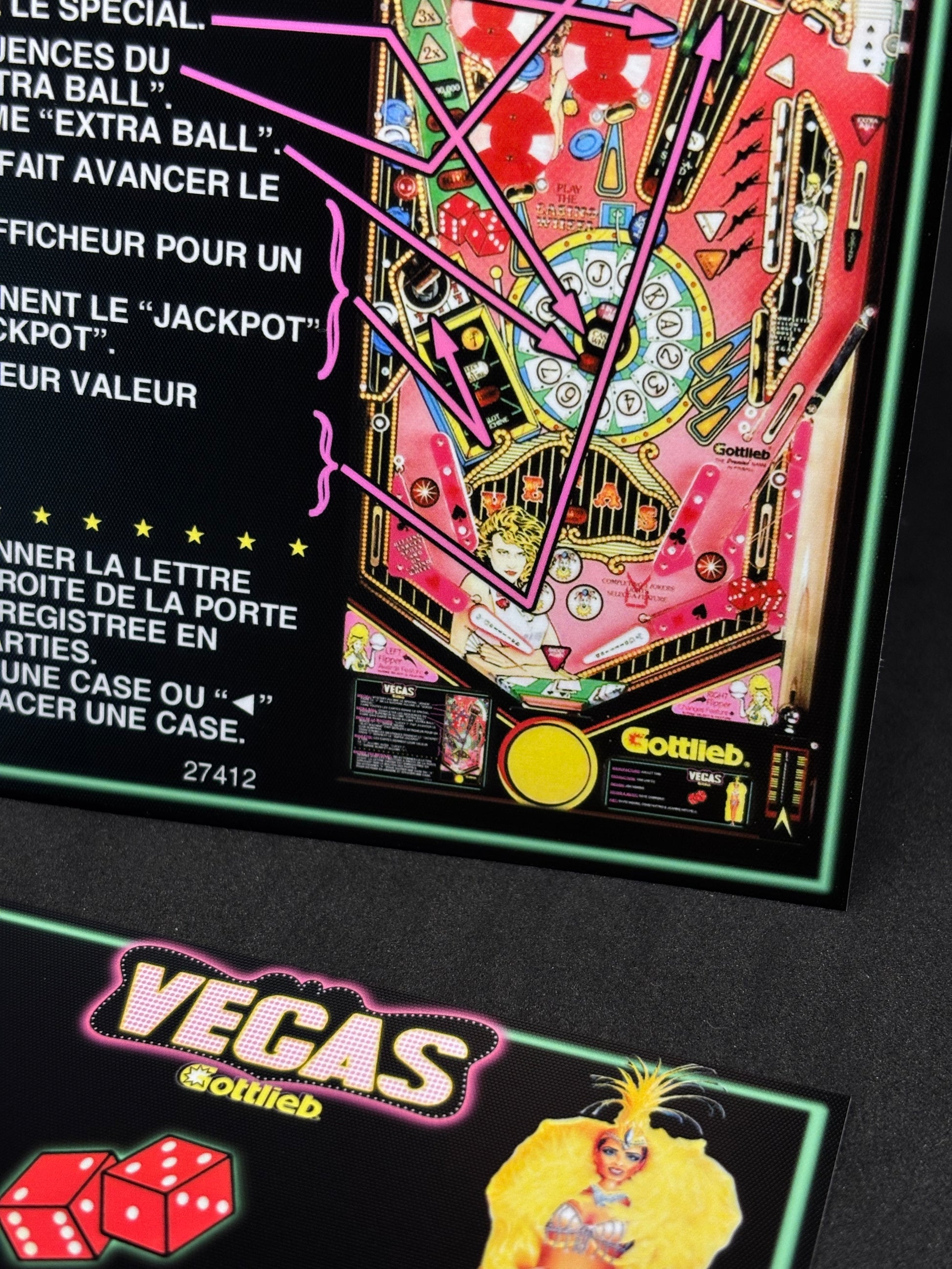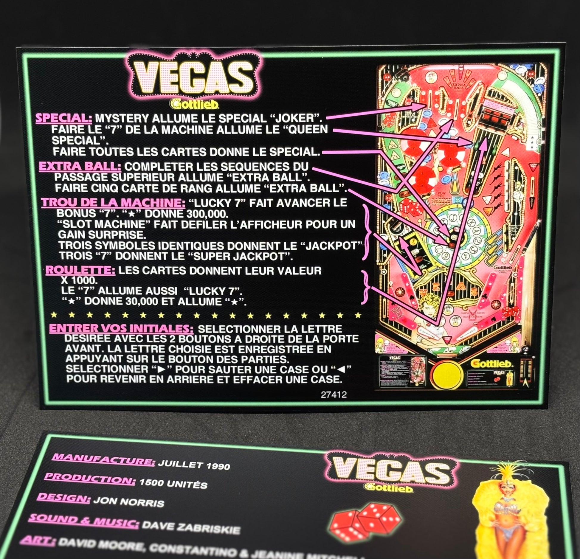 Gottlieb VEGAS 1990 Jeu Cartes Instructions Flipper Custom Apron règles imprimées V1