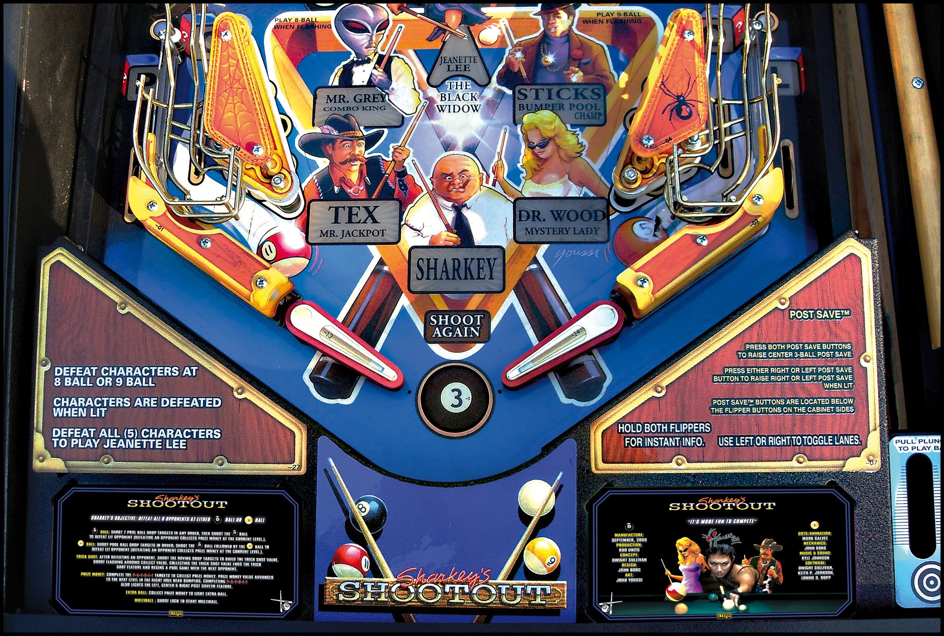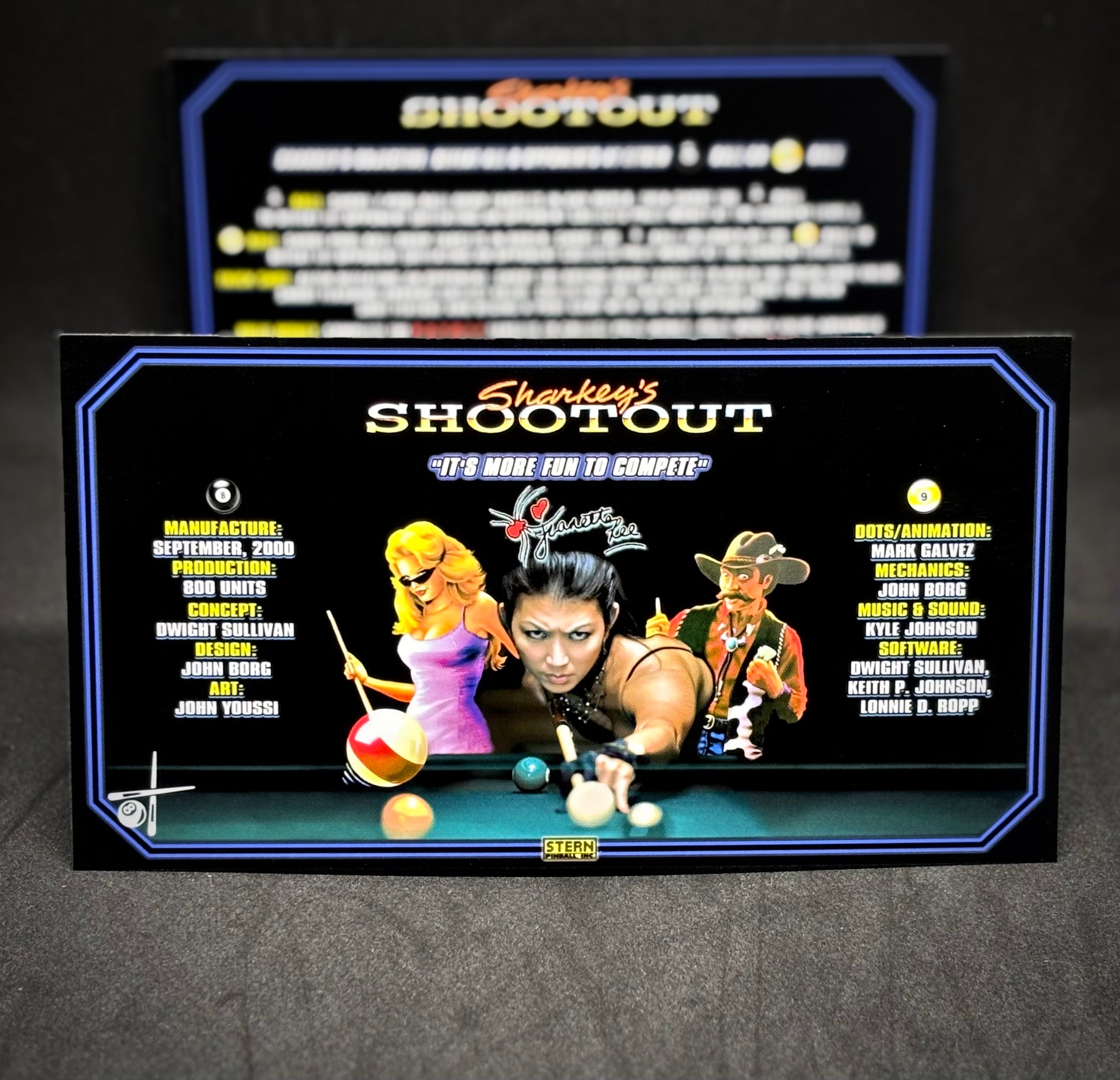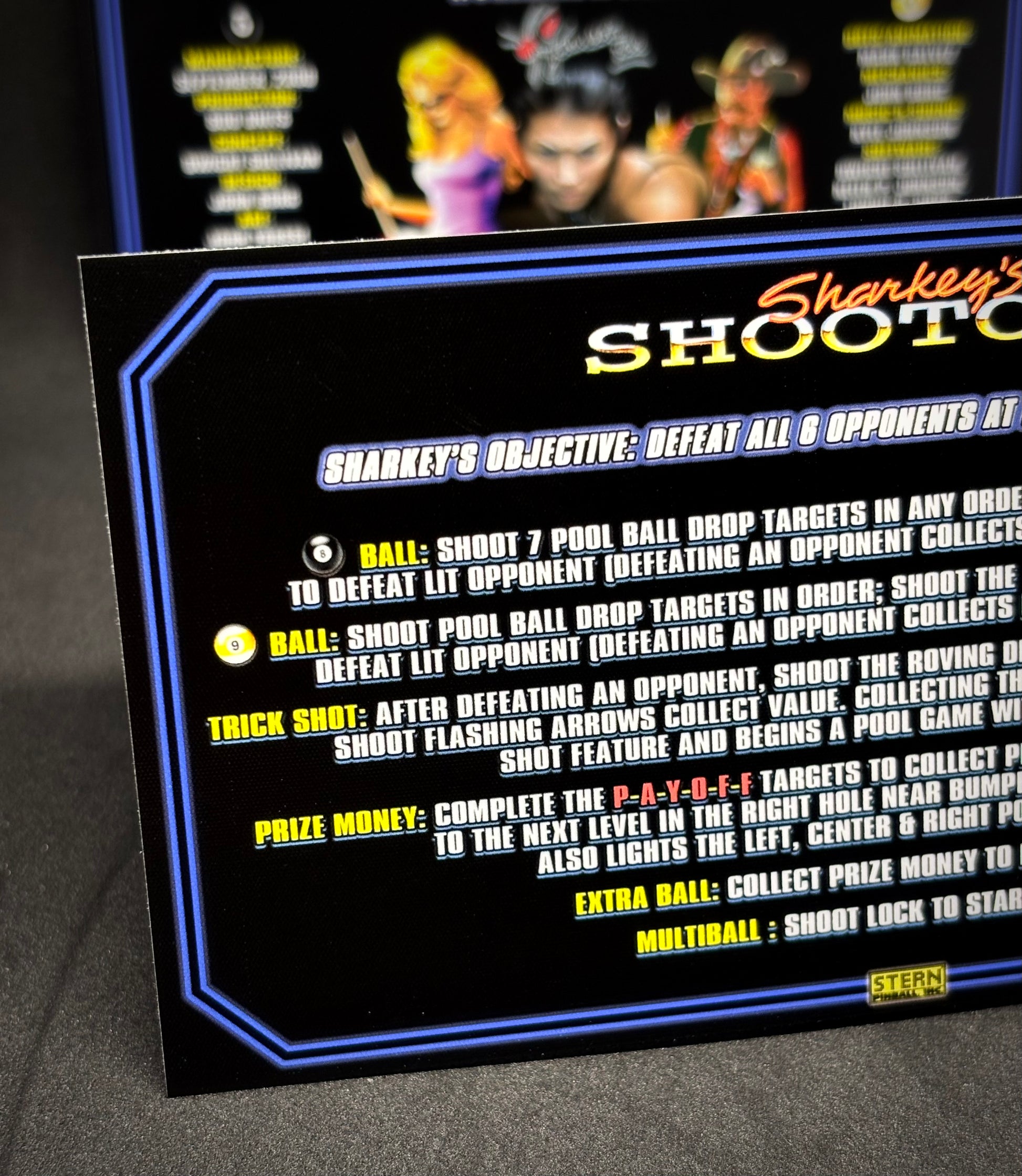 Instrucciones de las tarjetas de juego Stern Sharkey's Shootout 2000, reglas de las tarjetas de delantal de pinball con impresión personalizada de Pinball V2