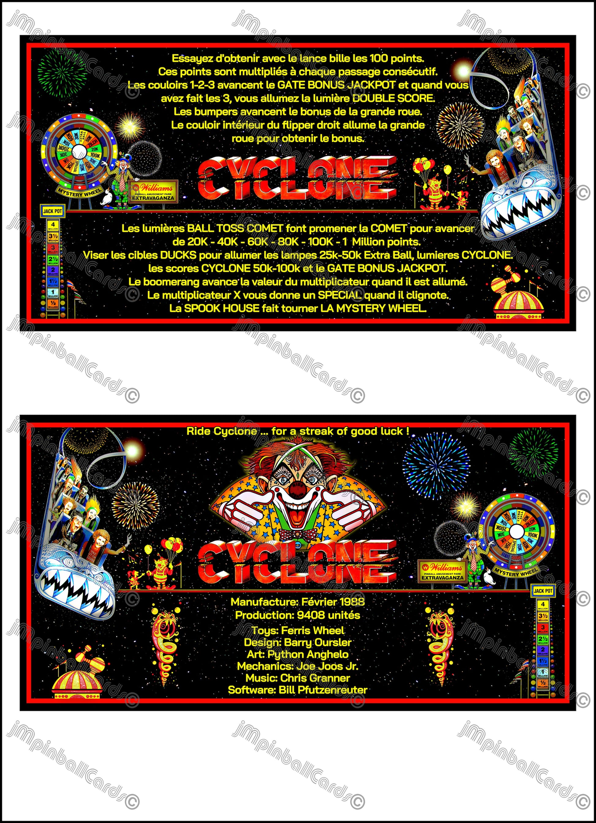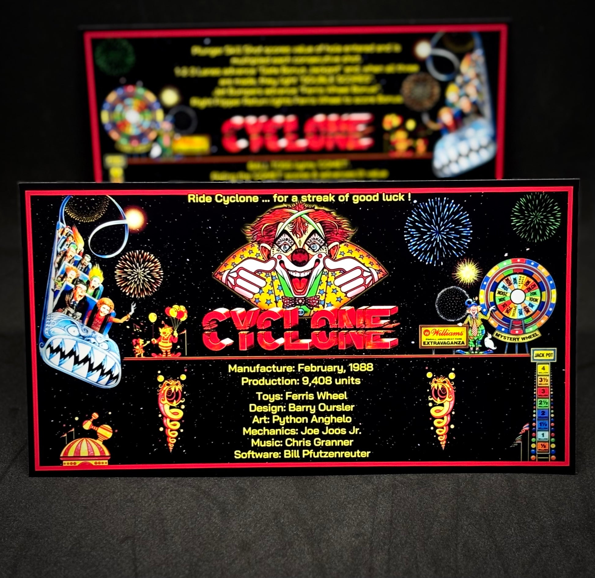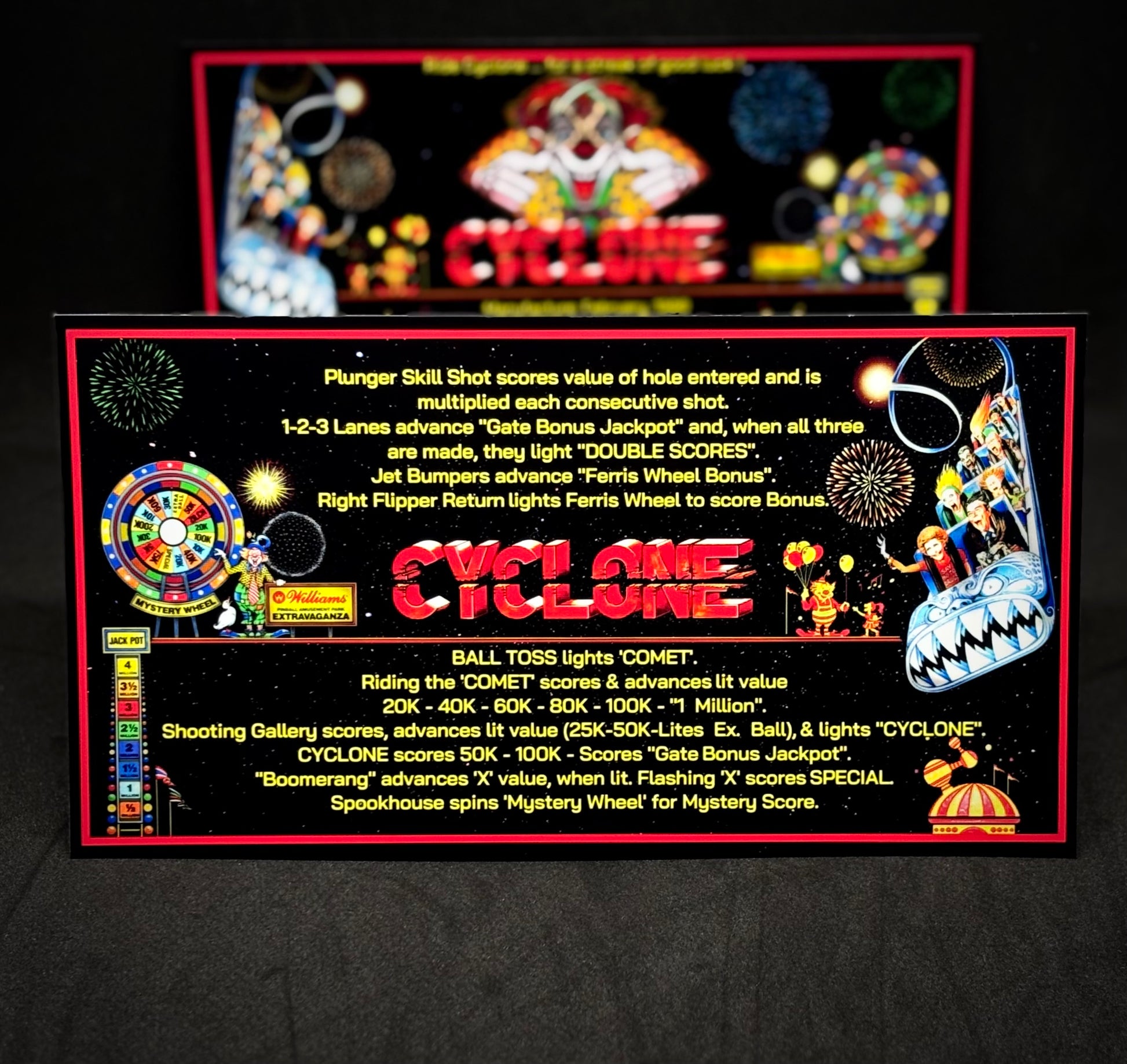 Instrucciones de las tarjetas del juego Williams Cyclone 1988, delantal personalizado de pinball, reglas impresas