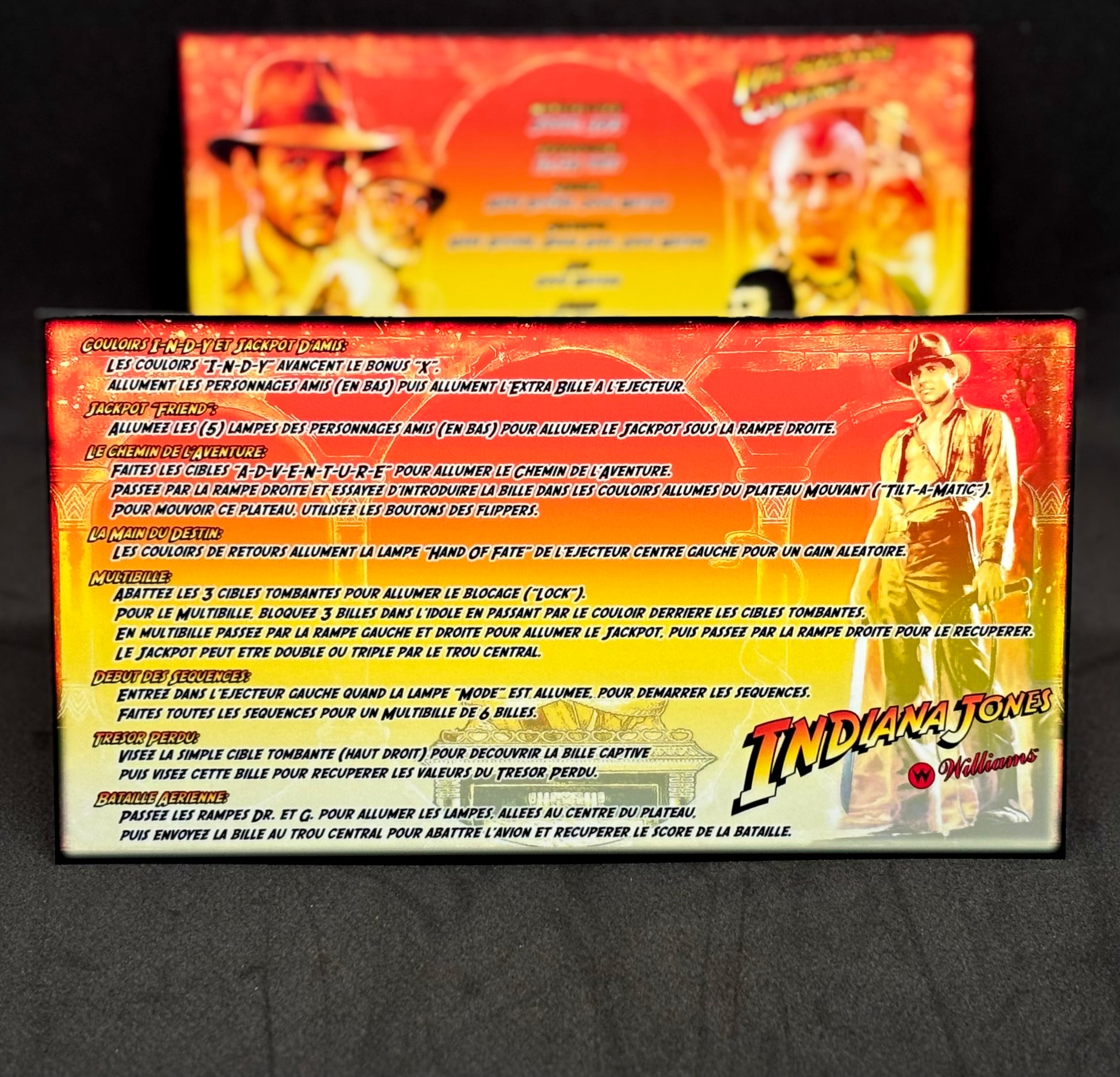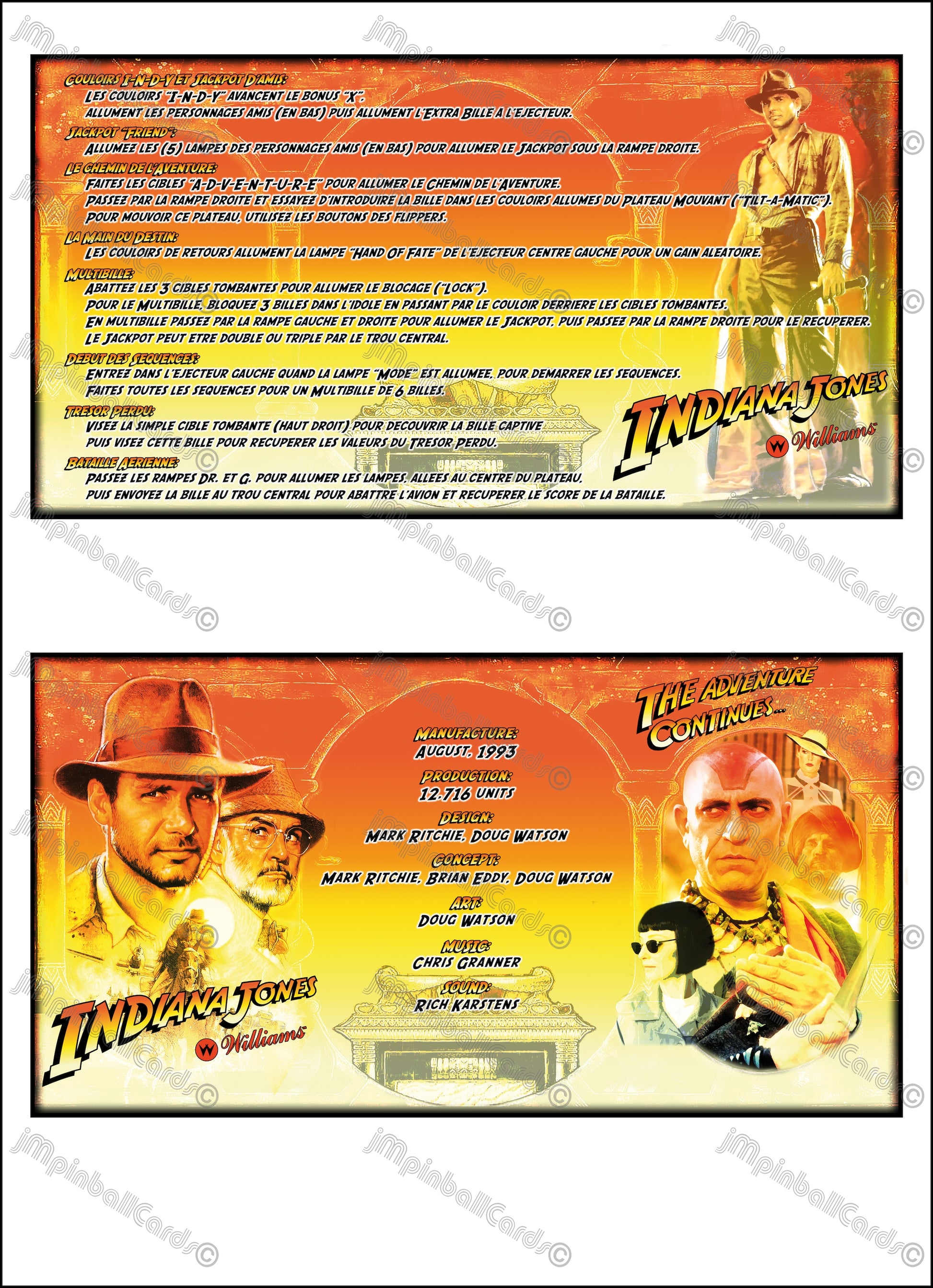 Williams Indiana Jones 1993 Jeu Cartes Instructions Flipper Custom Apron règles imprimées V2