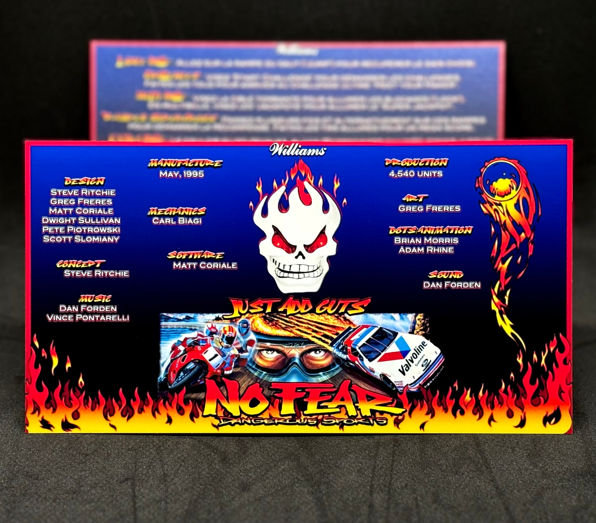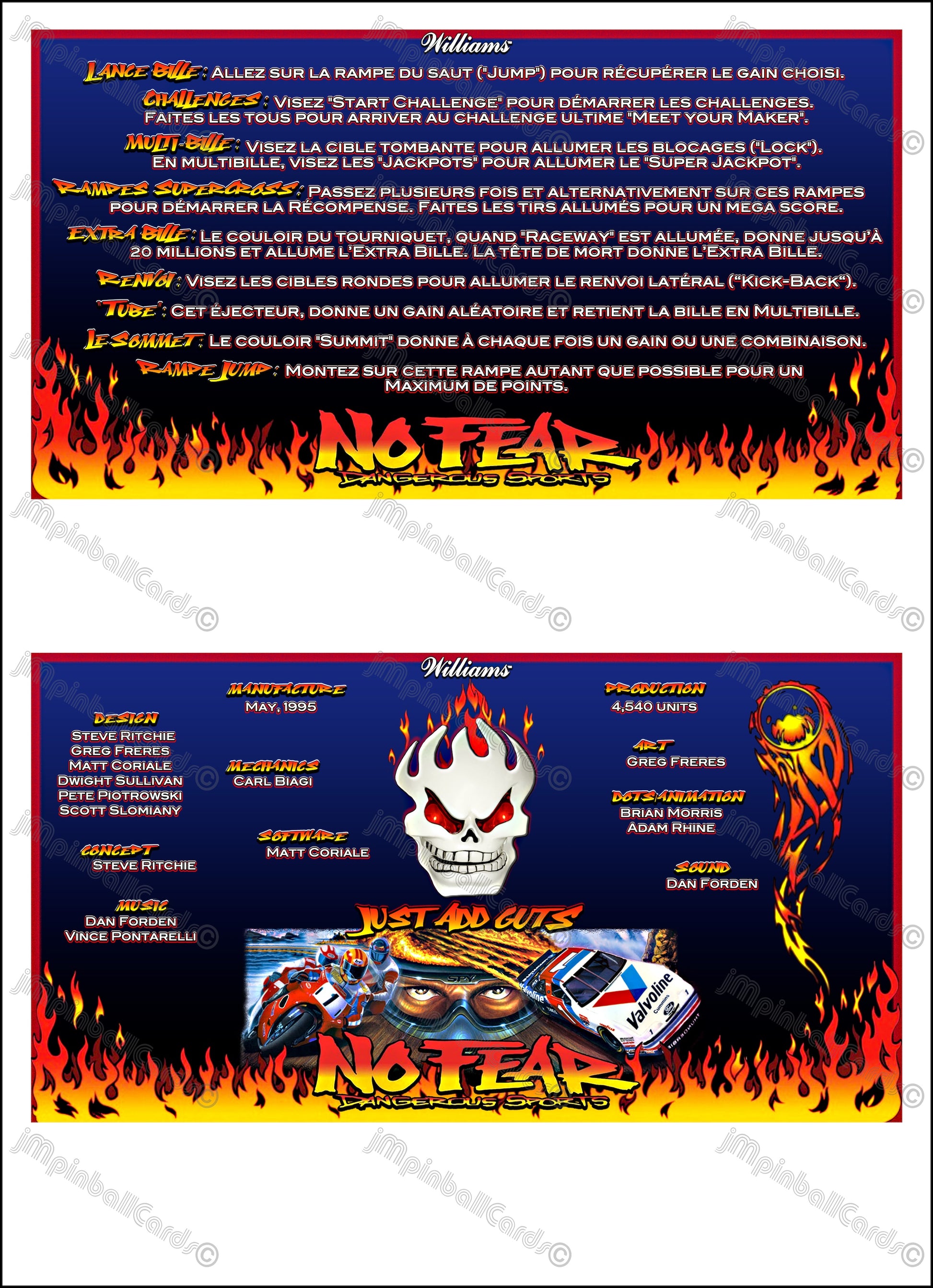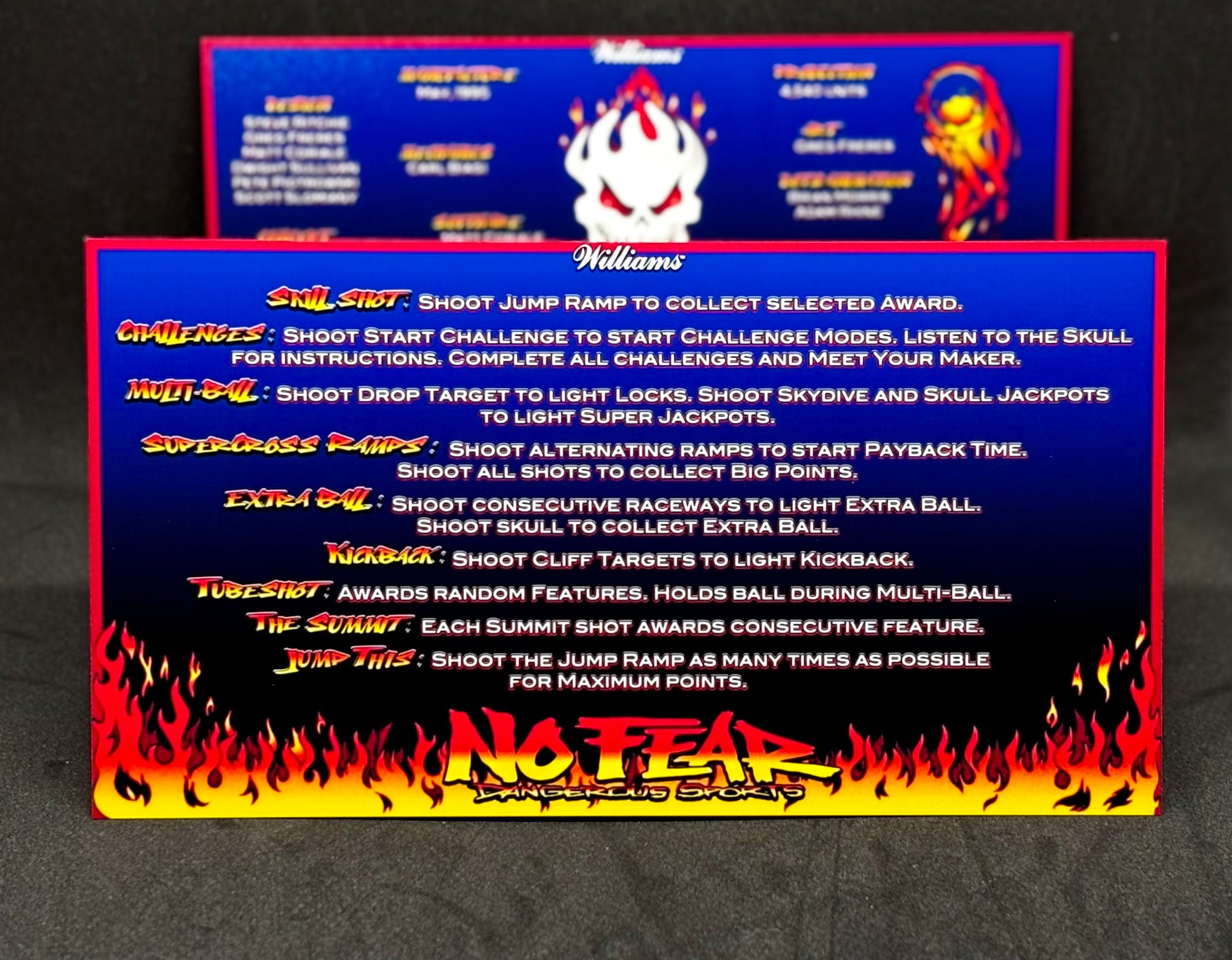 Instrucciones de las tarjetas del juego Williams No Fear Dangerous Sports 1995, delantal personalizado de pinball, reglas impresas