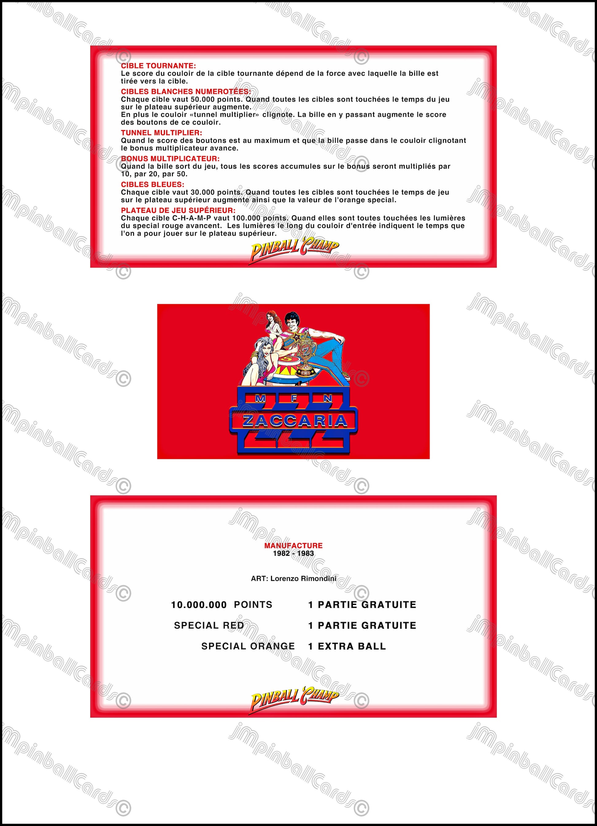 Zaccaria Pinball Champ 1982 1983 Set Tarjetas Instrucciones Flipper Delantal personalizado Reglas impresas