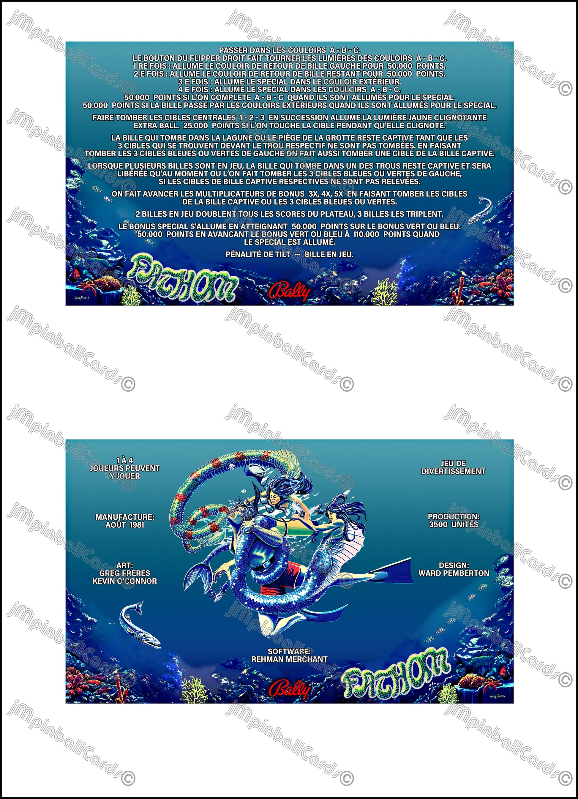 Bally FATHOM 1981 Jeu Cartes Instructions Flipper Custom Apron règles imprimées