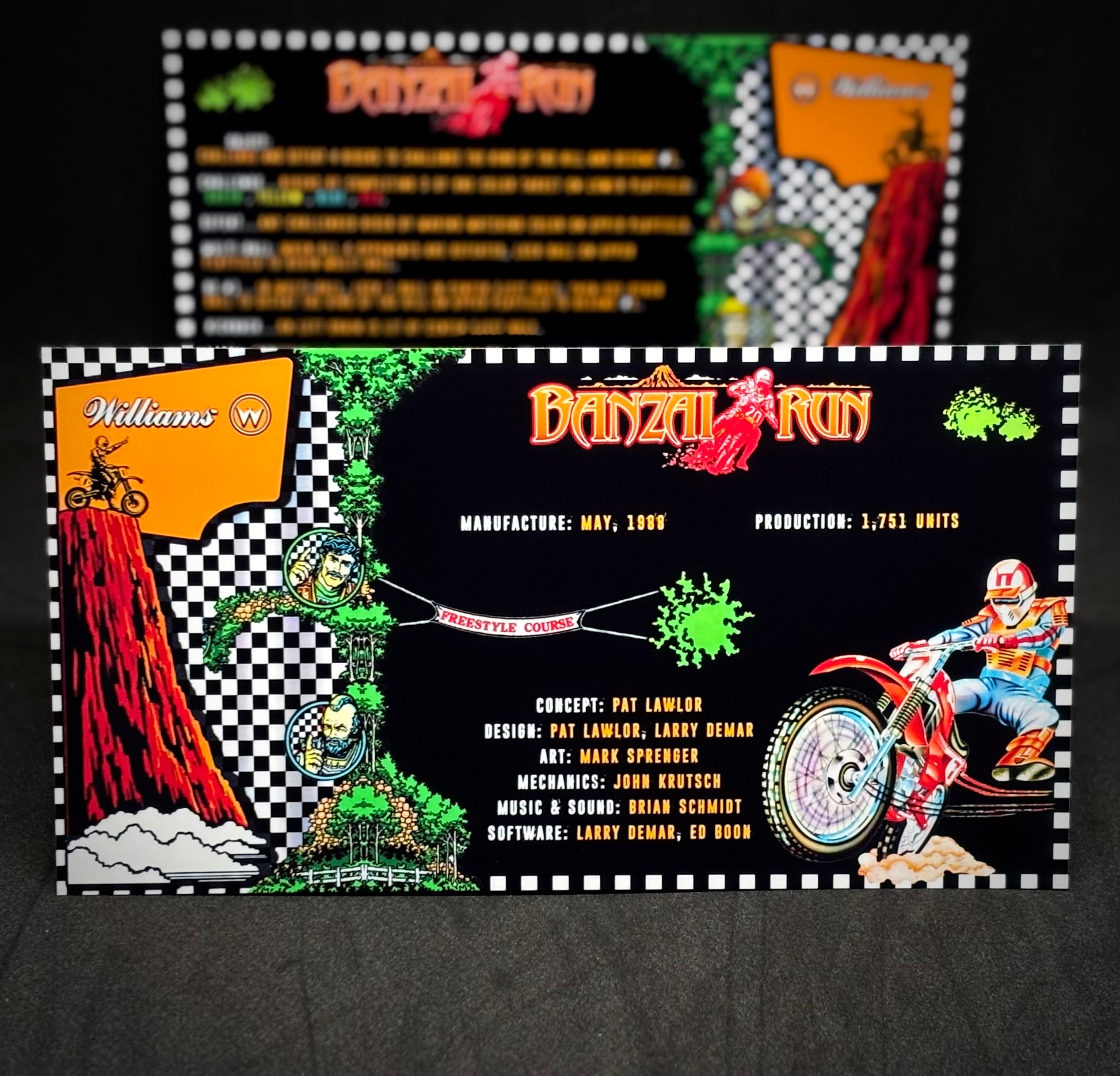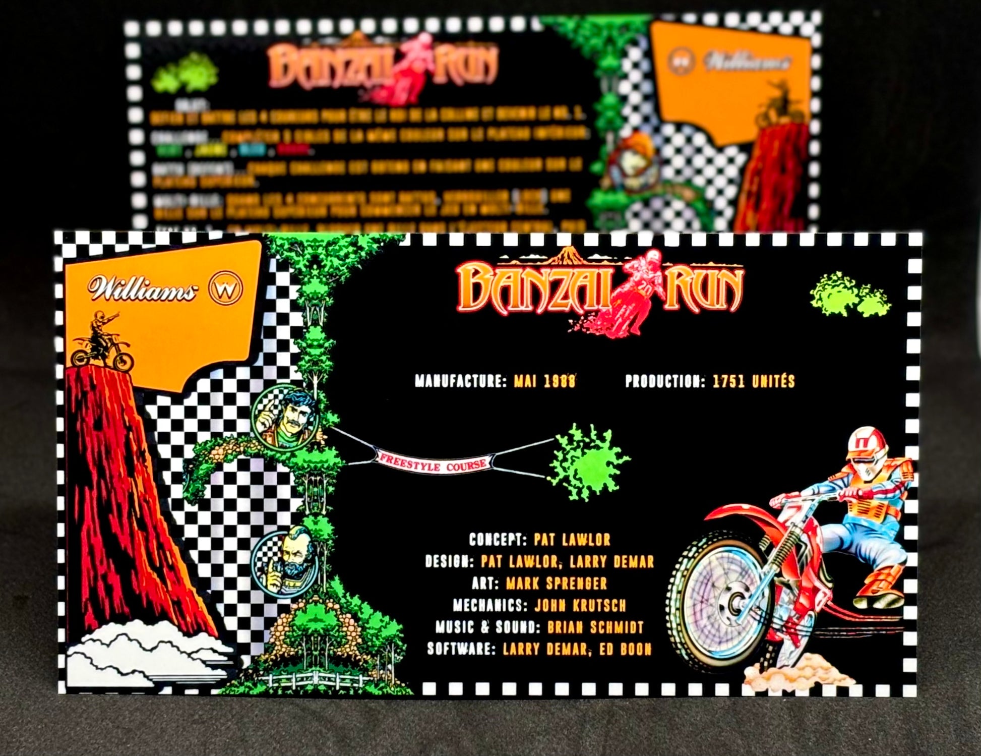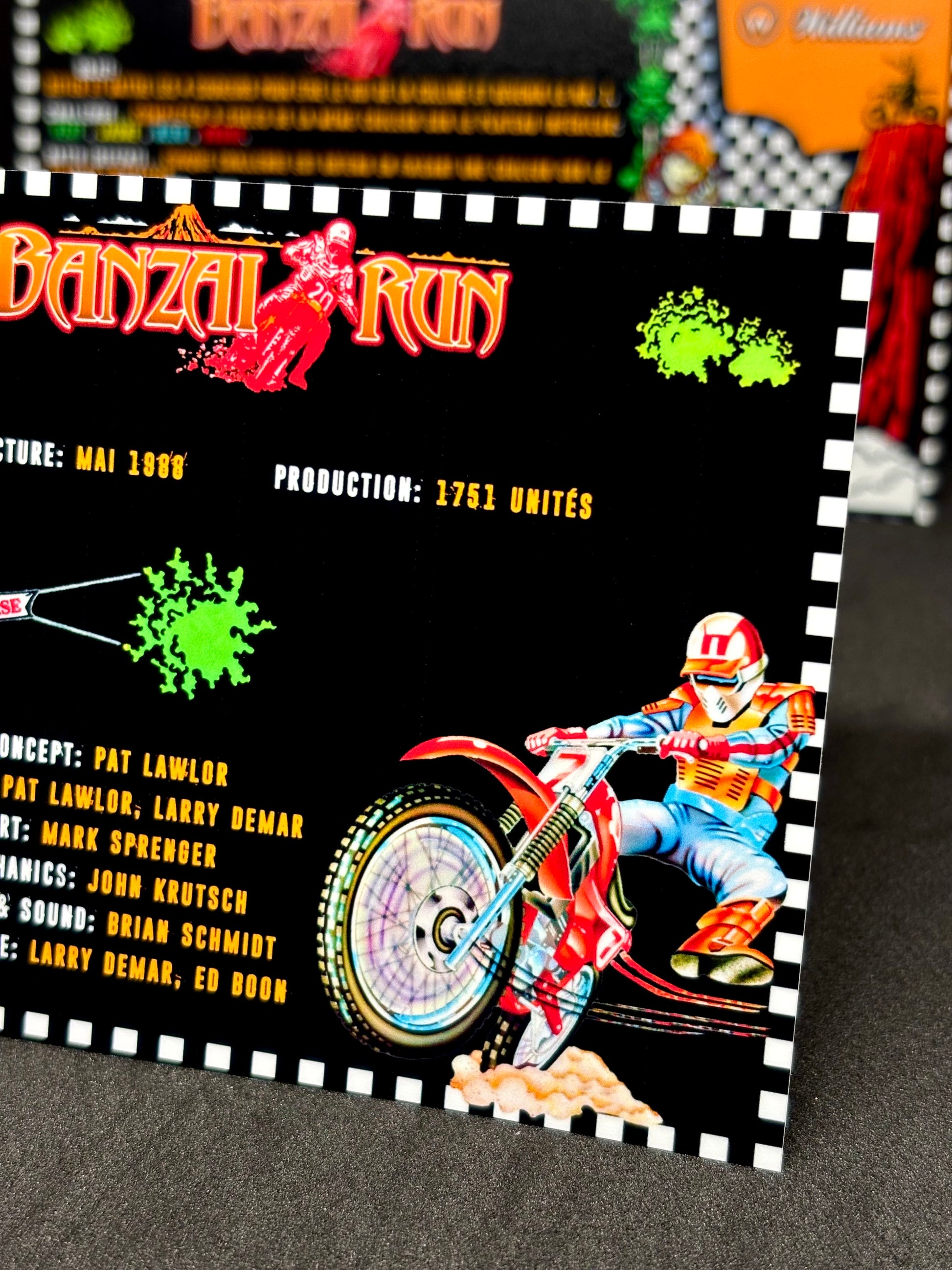 Williams Banzai Run 1988 Jeu Cartes Instructions Flipper Custom Apron règles imprimées